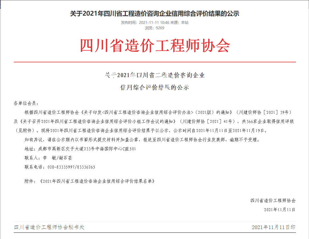 此次评选由四川省造价工程师协会组织,共计366家省内造价企业参加,按照<四川省工程造价咨询企业信用综合评价办法>(2021版)的通知》(川建价师协[2021]39号)的相关文件要求,经组委会的专业性审核和综合审查,最终评选出结果。
