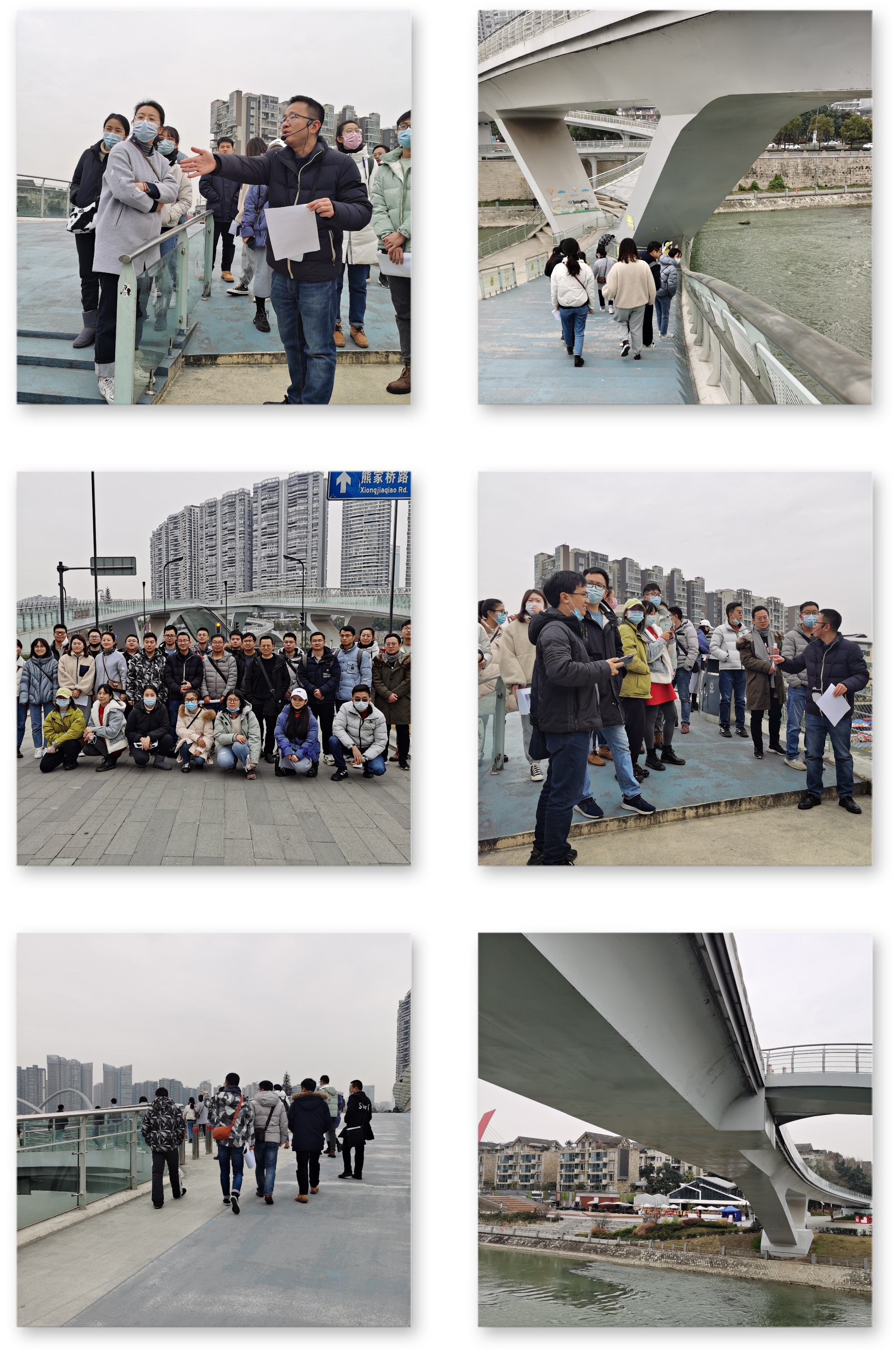 参观首站来到了成都五岔子大桥。该项目位于成都高新南区府河沿线,是连接高新区桂溪和中和街道的重要慢行桥梁,总面积4180㎡,是国内首座“莫比乌斯环”式异形拱桥。该桥分为主、副桥,主桥在上,连接两岸绿道,自行车可以通行;副桥在下,有观河的环绕式剧场台阶,市民可坐在台阶上,欣赏河景或观看表演。现已成为网红打卡圣地。在参观现场,南部业务区总工肖春首先通过展板向大家概况介绍了桥梁的设计创意、结构形式、主要指标、设计难点等,接着大家沿着大桥边参观边交流,在参观交流中加深了对桥梁设计创意、结构形式的理解。