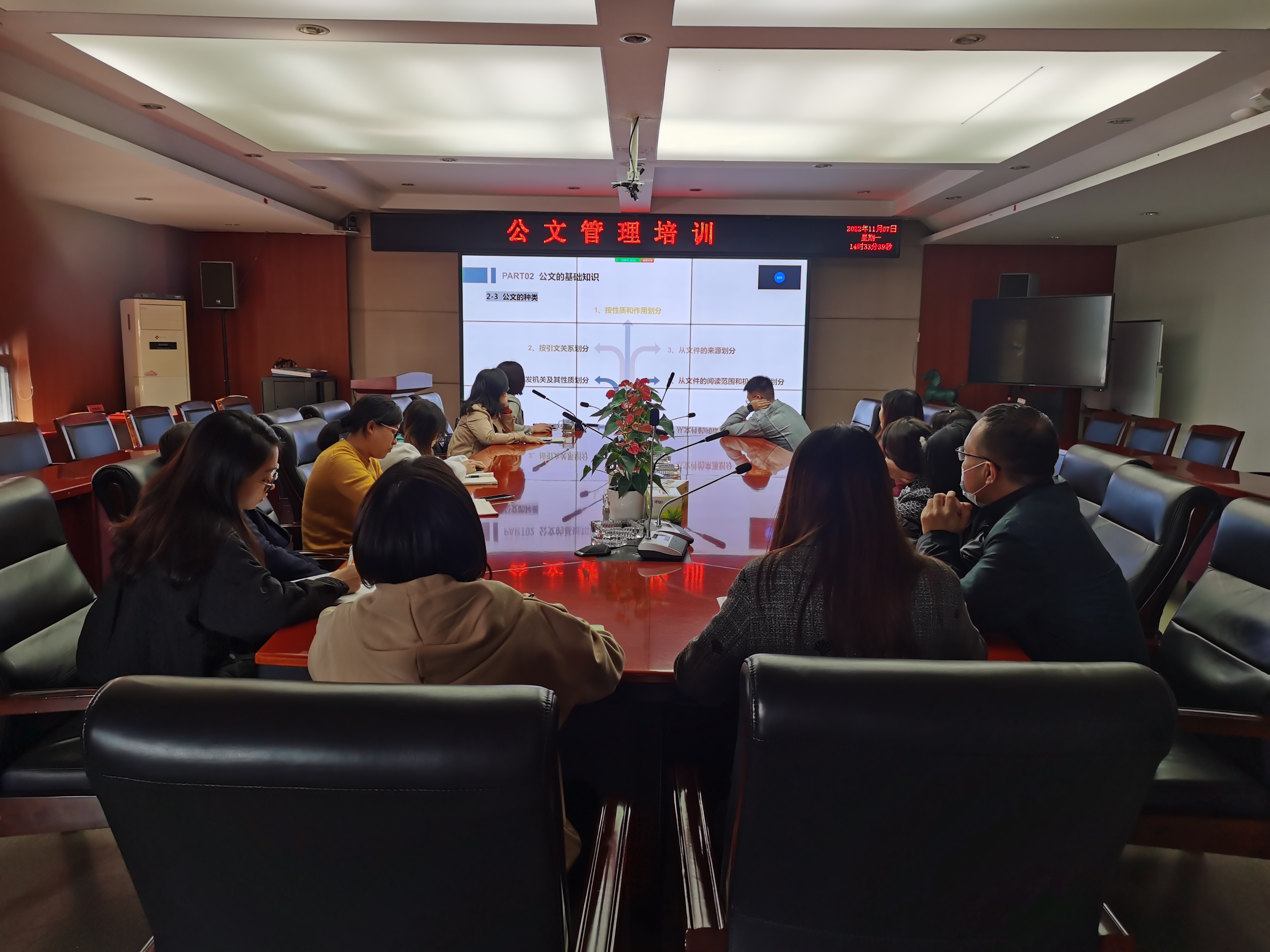 本次培训的主讲人为集团综合部高级主管蒲丽萍。在培训会上,蒲丽萍主要从公文的种类、公文的格式、公文的应用、公司公文管理制度等四大方面对公文的相关知识进行了详细讲解,并结合实际案例针对请示与报告的区别、正文标点符号的使用、公文标题、公司的发文流程、公司及各部门发文字号的运用做了重点讲解,加深了大家对公文相关知识的熟悉和理解,有助于大家在后续公文处理工作中做到规范运用。参训学员还就工作中遇到的公文相关问题进行了互动交流。