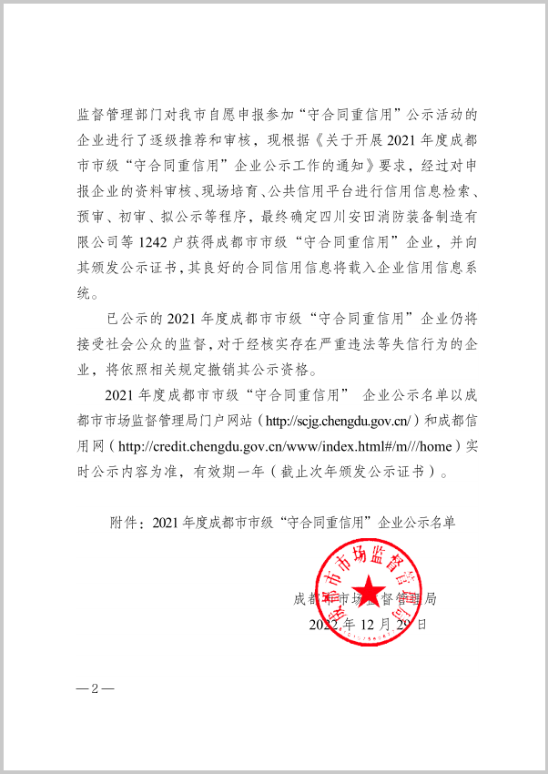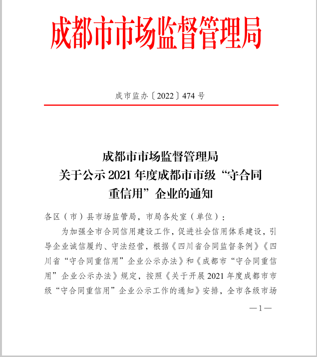 近日,成都市市场监督管理局发布《关于公示 2021 年度成都市市级“守合同重信用”企业的通知》,太阳成集团tyc122cc入口工程设计院有限公司荣获“2021 年度成都市守合同重信用企业”称号。