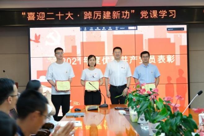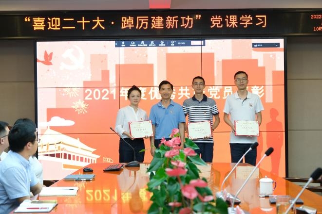 会议同时对评选出的“2021年度优秀共产党员”进行了表彰。杨光同志和邹永红同志分别向优秀党员代表颁发了荣誉证书,并鼓励他们珍惜荣誉、再接再厉,永葆共产党员的先进性。